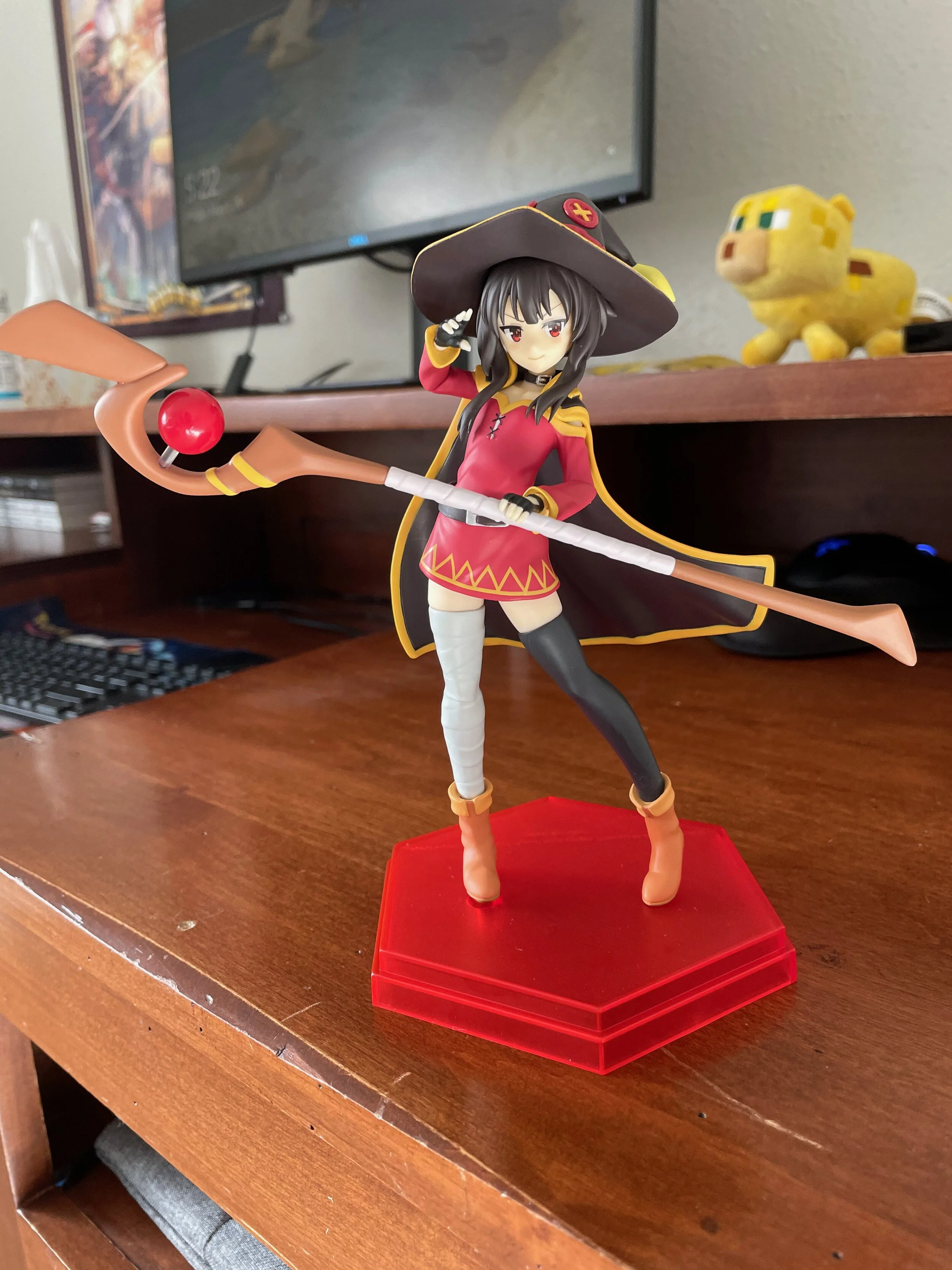 Unlike other figures, this Megumin is actually only pegged in with one foot, so you do not need to worry about keeping her pegged in due to shrinkage or stretching.