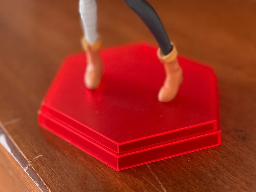 With Sawatari Izumi, we had a boring, semi-transparent, yellow, circle base. This base follows a similar formula. It is a flat, semi-transparent, red, hexagon base.